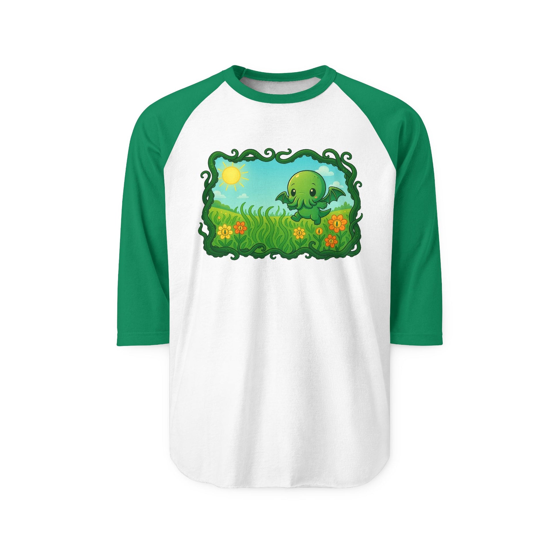 Sunshine, tentacles, and slightly suspicious flowers — what’s not to love? This cheerful 3/4 sleeve raglan tee features an adorable meadow-dwelling baby Cthulhu frolicking among flowers in a bright, sunny landscape. It’s the perfect blend of wholesome cottagecore and gentle cosmic nonsense — ideal for anyone who likes whimsy, horror, and tentacle-shaped grass.
