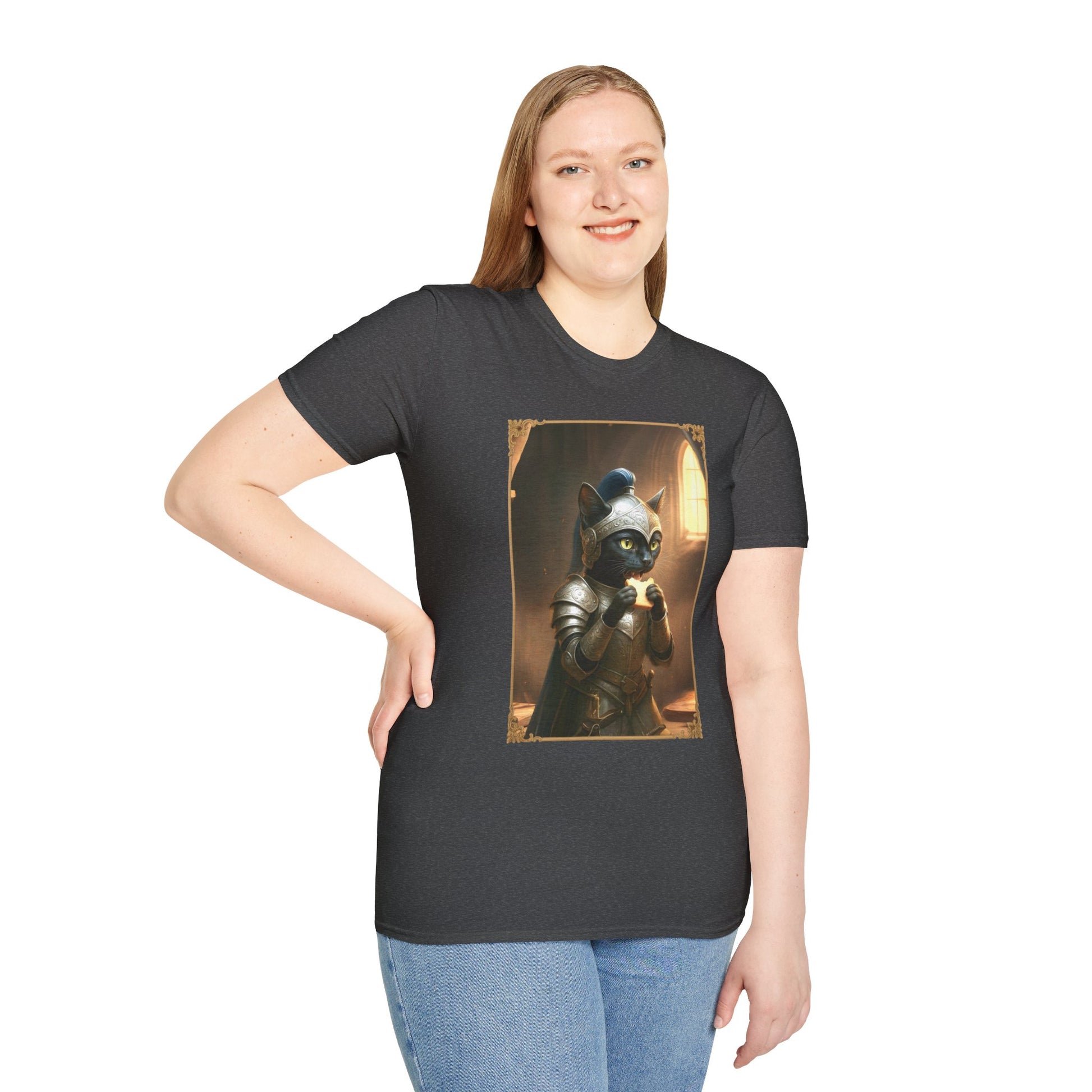 ⚔️ This shirt features a striking portrait of a cat in full medieval armor, rendered in a rich, oil-painting style with glowing highlights. Regal, gothic, and whimsical all at once, it’s the perfect blend of fantasy art and feline charm.