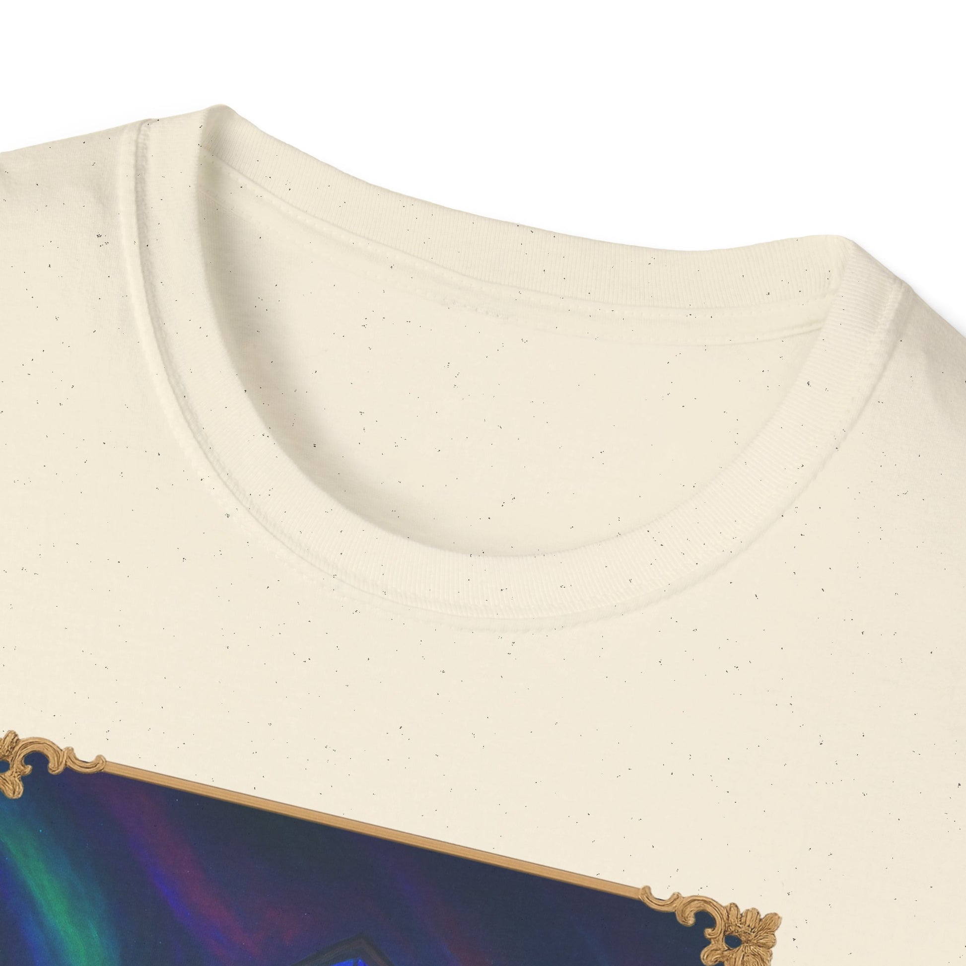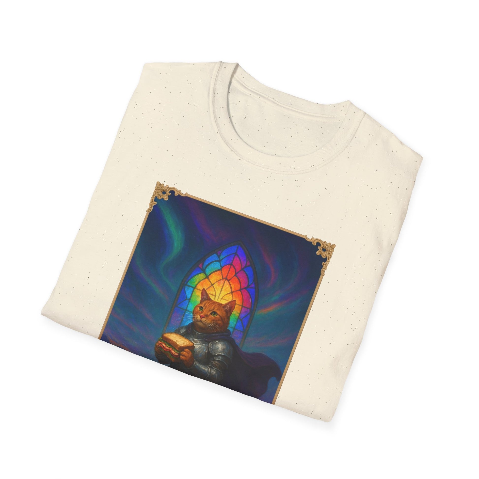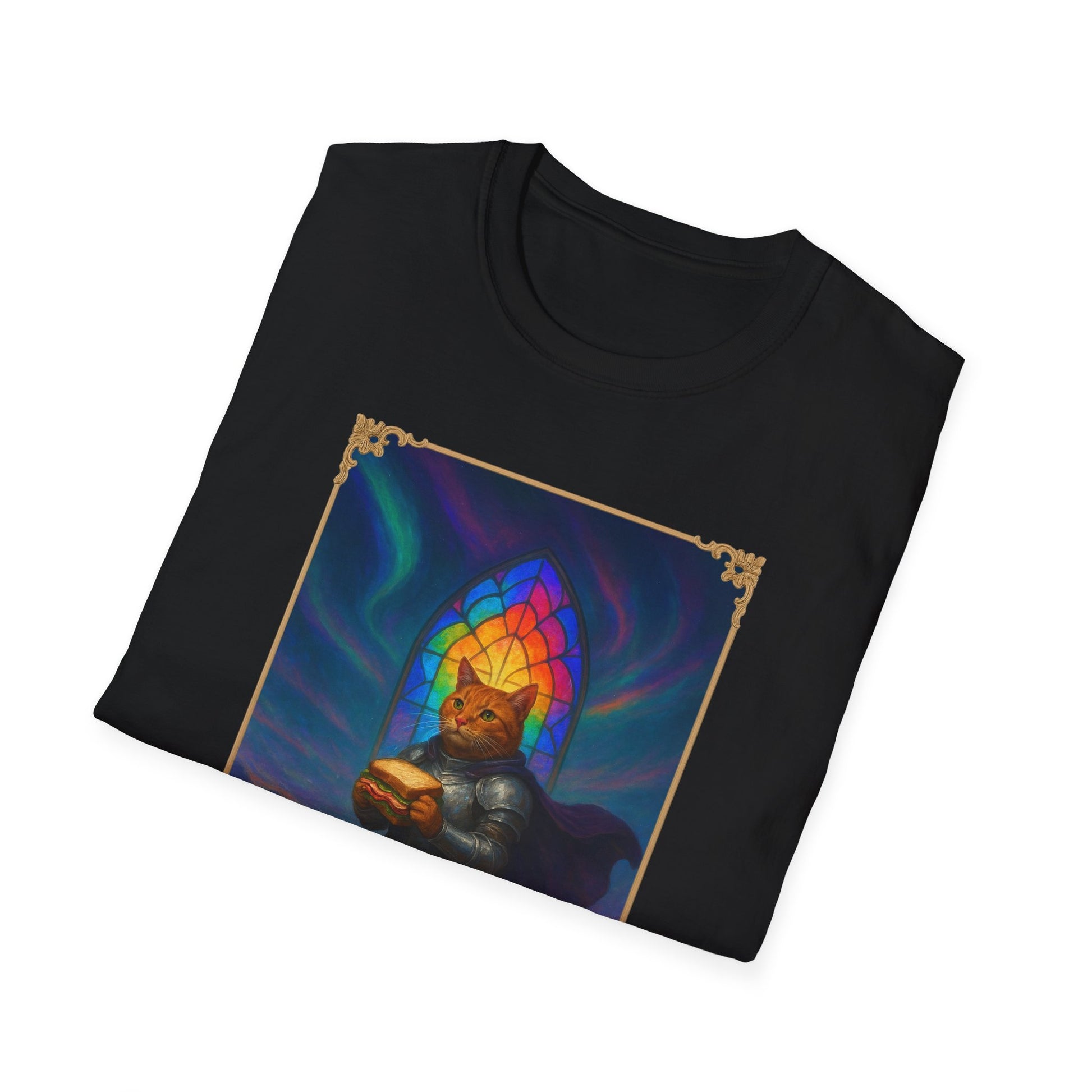 This bold T-shirt features a cat in shining medieval armor, seated beneath a glowing stained glass window, proudly holding a sandwich as if it were holy treasure. With its radiant colors and whimsical fantasy vibe, this design fuses gothic elegance with playful humor.