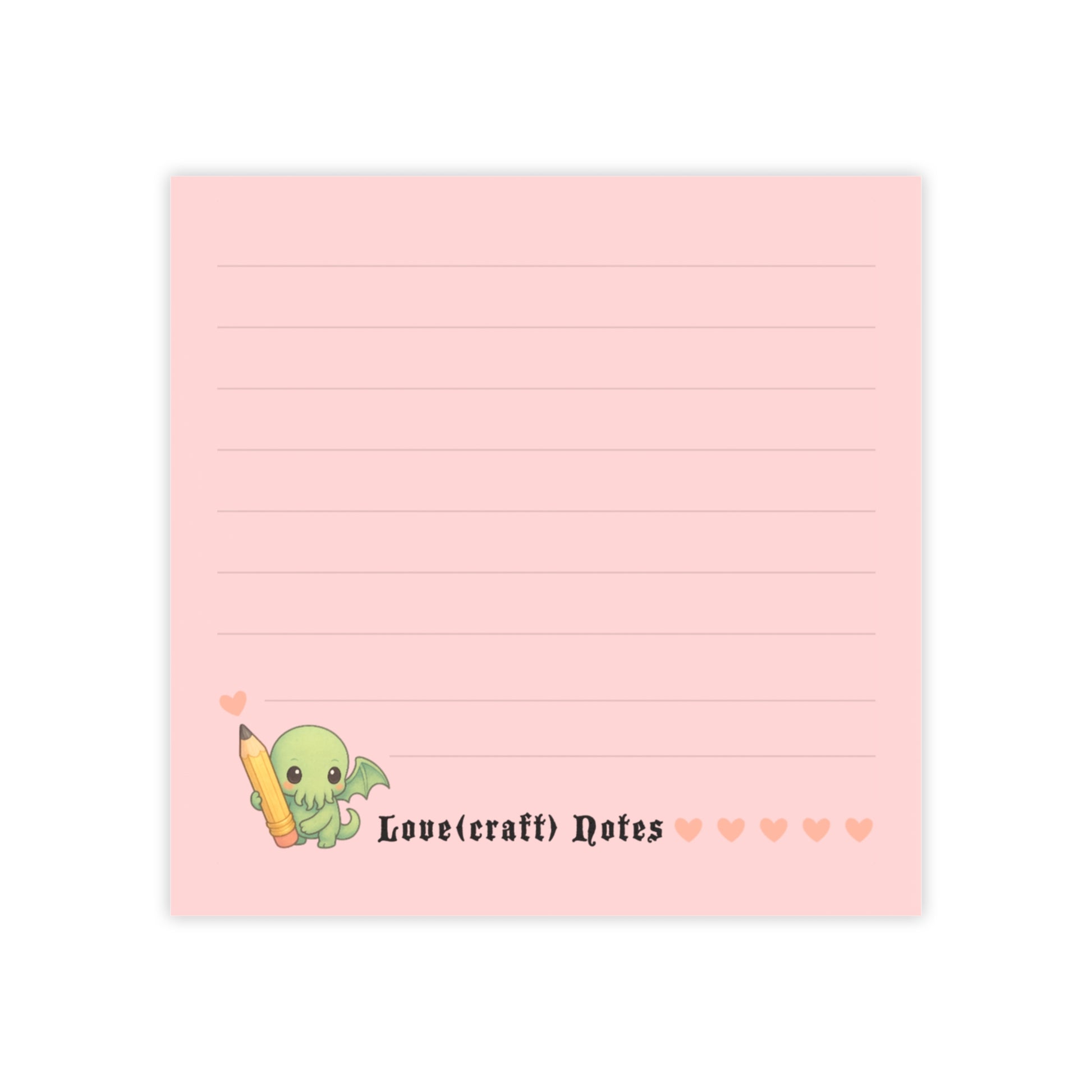 - Bottom corner design: chibi Cthulhu holding a giant pencil, with the phrase “Love(craft) Notes” in gothic script