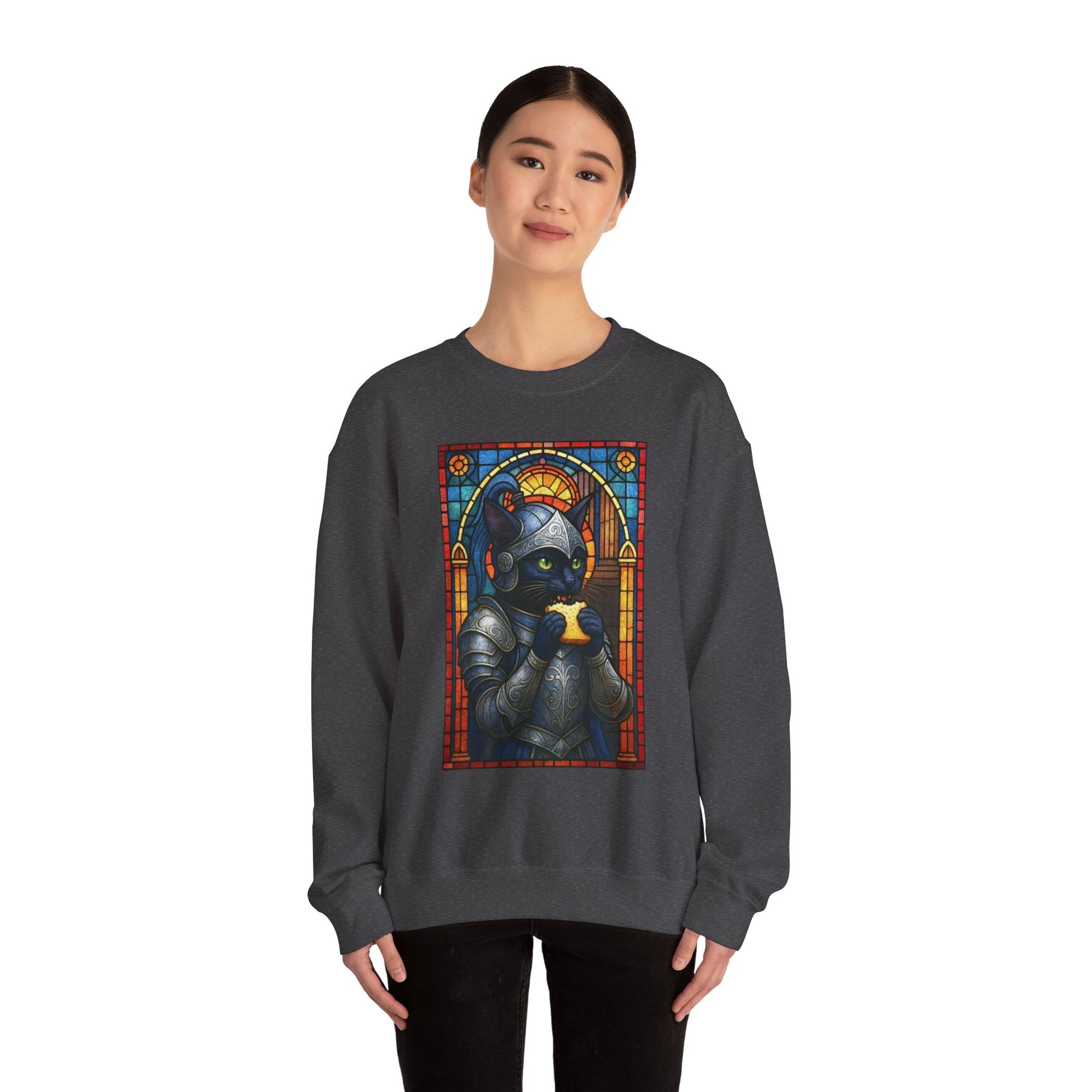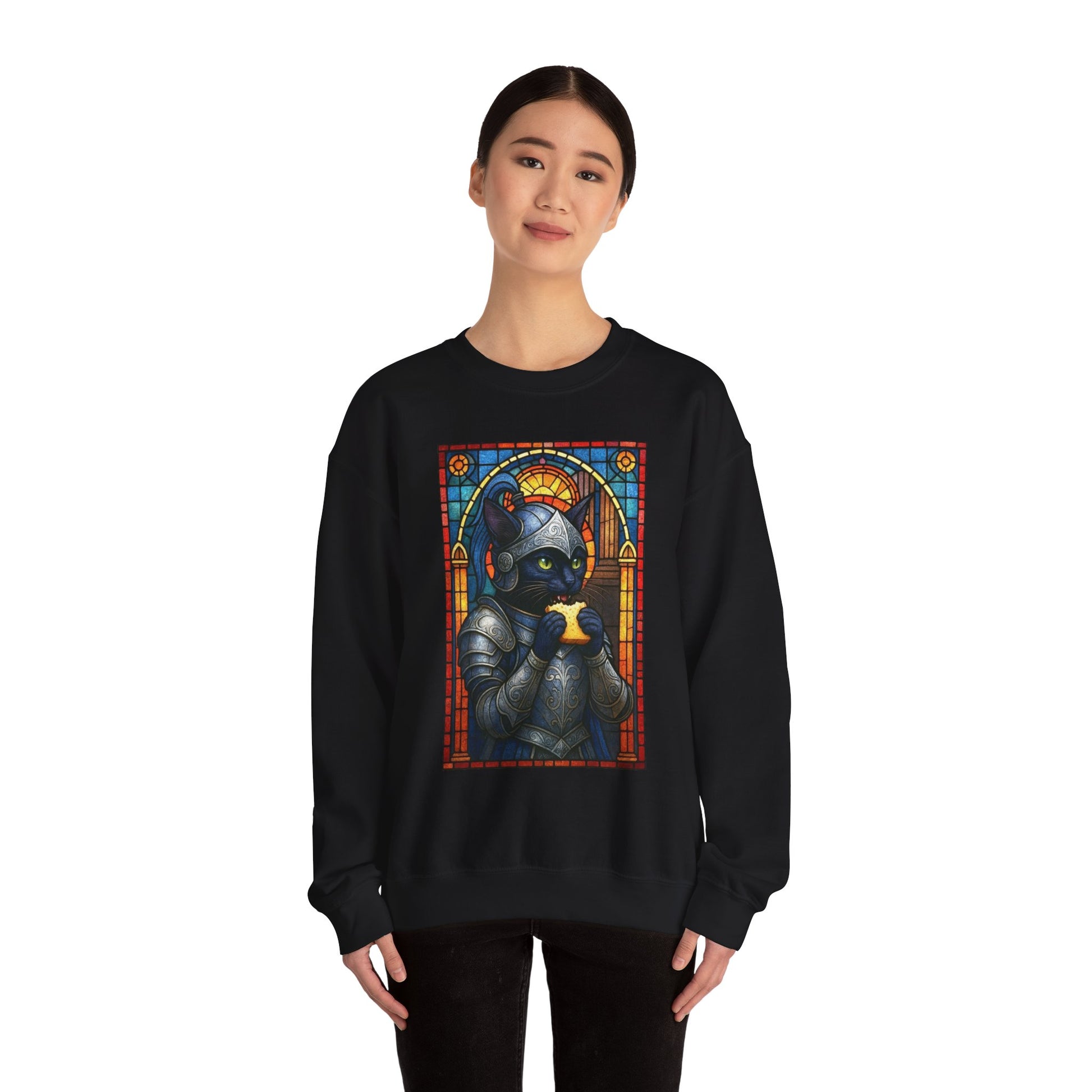 This sweatshirt features a black cat in full medieval armor, caught in a holy moment: savoring a sandwich. Rendered in vibrant stained glass window style, the design blends gothic cathedral art with playful feline charm.