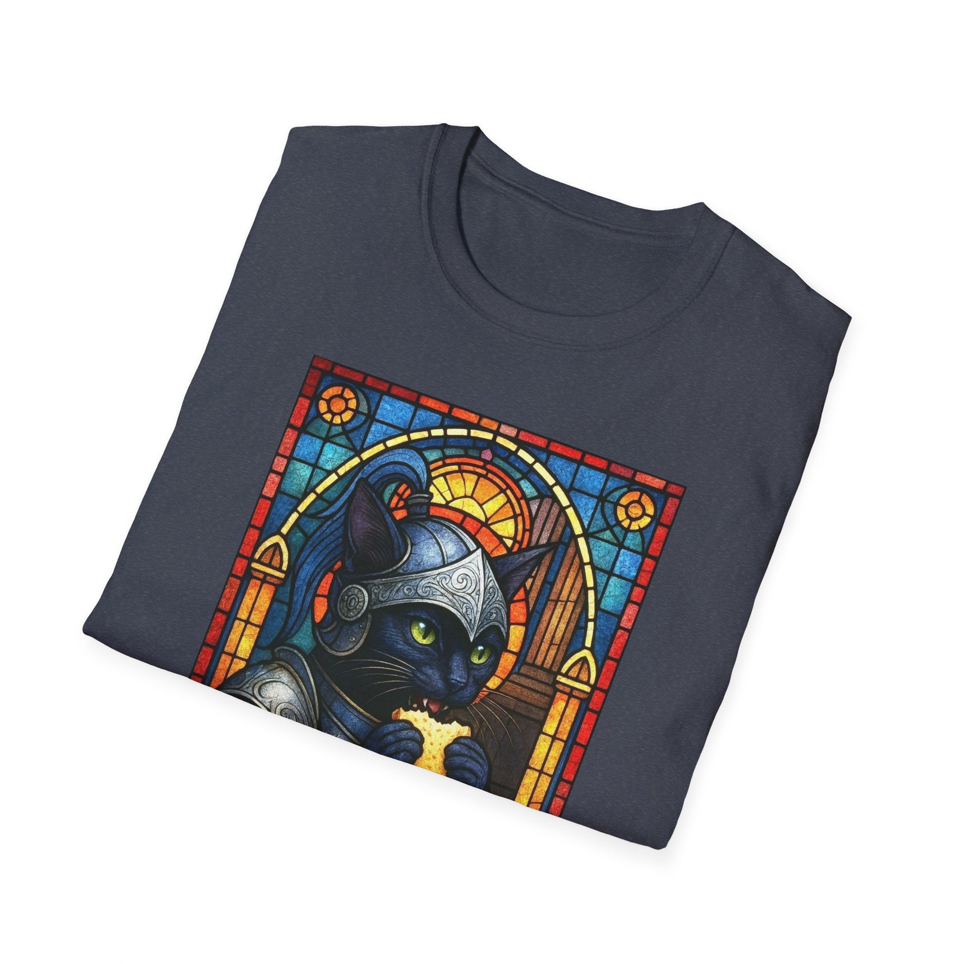 This T-shirt features a black cat in full medieval armor, caught in a holy moment: savoring a sandwich. Rendered in vibrant stained glass window style, the design blends gothic cathedral art with playful feline charm.