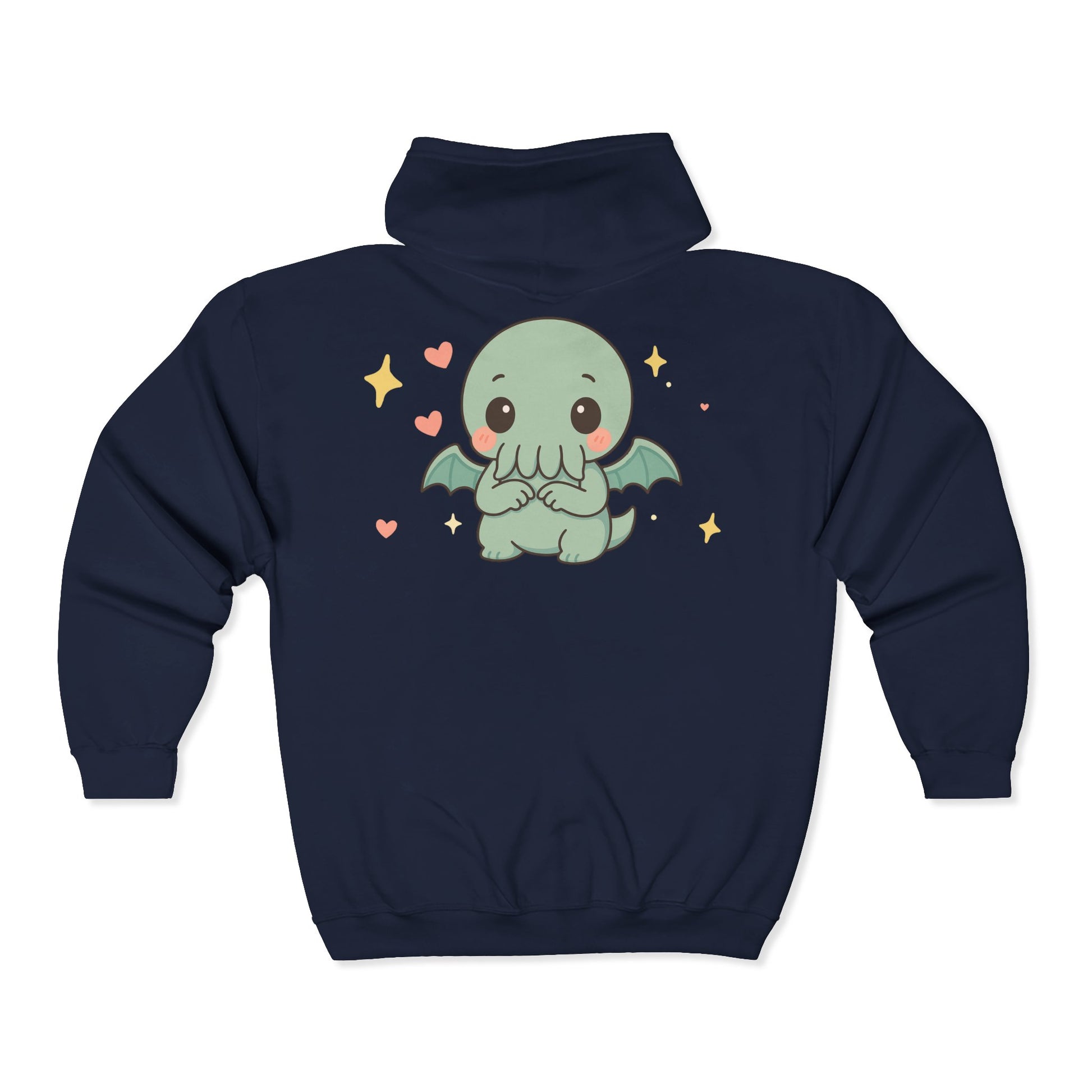 đđ Snuggle up with cosmic cuteness! This unisex full-zip hoodie features an adorable chibi Cthulhu designâtiny wings, blushing cheeks, and big eyesâthatâs equal parts spooky and sweet. On the back, Cthulhu takes center stage surrounded by stars and hearts, while the front has a smaller matching design for an extra whimsical touch.