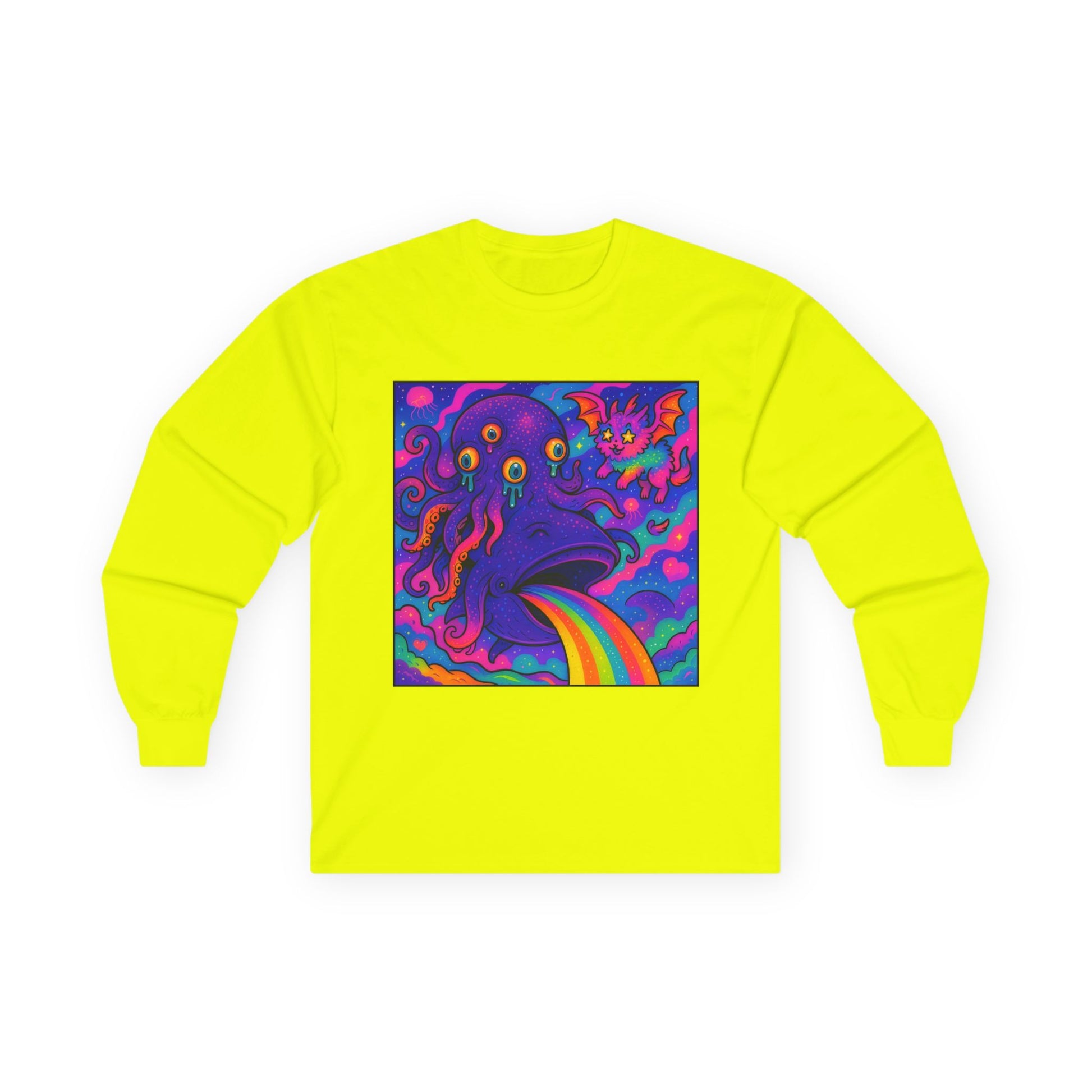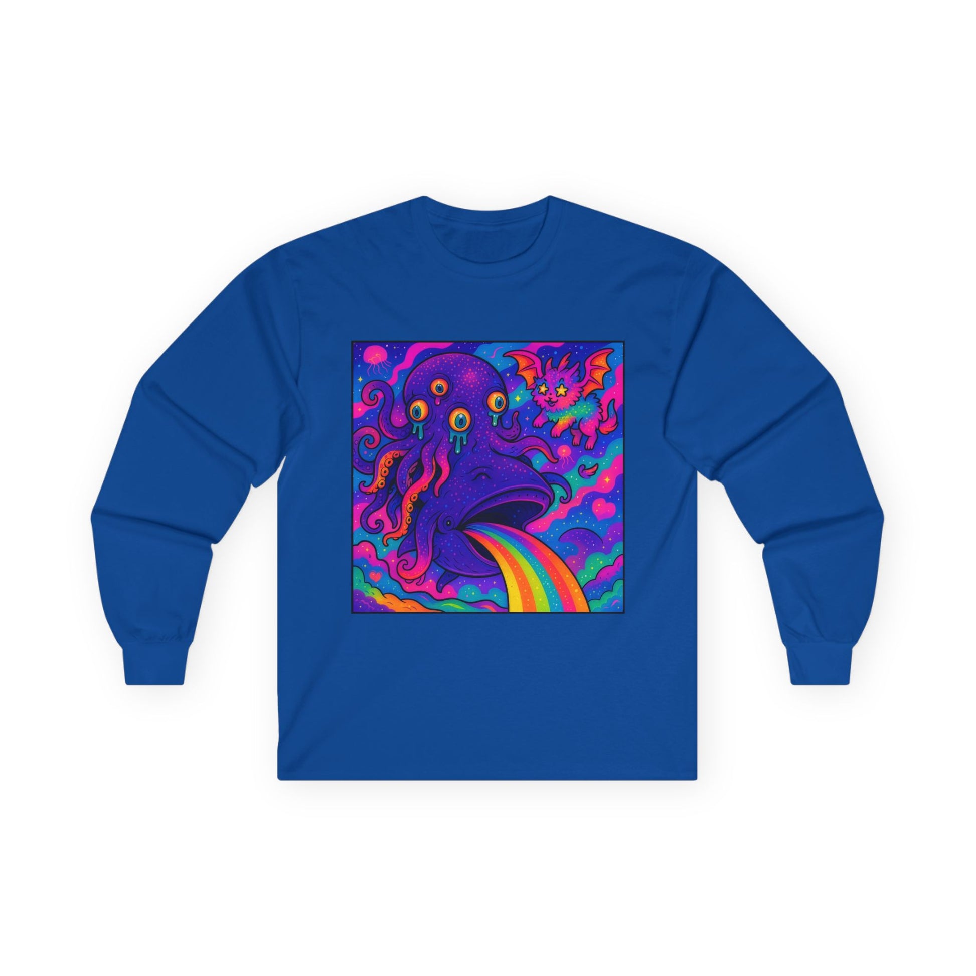 Taste the rainbow...of unknowable cosmic truths. This long-sleeve unisex tee features the Sparklewhale Nebula, an unhinged Lisa-Frank-inspired cosmic beast spewing rainbows into the void. Meanwhile, a tiny chaos gremlin cheers it on from above. This shirt is bright, surreal, and overflowing with chaotic good energy — ideal for anyone who loves their eldritch horror cute, their colors neon, and their vibes turned up to 11.
